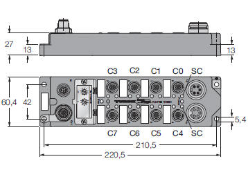(bottom). I/O are connected using M12 connectors (centre). The I/O